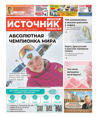 Еженедельная газета «Источник новостей» – одно из самых популярных изданий в Республике Коми. Основные темы: информация о событиях в регионе, политика, культура, социальные проблемы и многое другое. Еженедельник рассчитан на широкий круг читателей.
