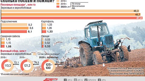 Планы на нынешний сельскохозяйственный год были грандиозные. По прогнозам, в 2020‑м мы должны собрать 125–130 млн т зерновых и приблизиться к рекорду 2017-го с его урожаем в 135 млн т. Общие посевы увеличены с 79 до 80,3 млн га при небольшом изменении структуры агрокультур. Из-за предыдущего перепроизводства сахара решили на 5% сократить посевы сахарной свёклы, на столько же – подсолнечника. При этом ожидалась прибавка по кукурузе и гречихе на 6%, сое – на 4,4%, овощам – на 3,4%. Общая тенденция – обеспечить продбезопасность страны и увеличить экспорт. Но планы строились до пандемии и скачков курса рубля. А что теперь?