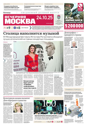 «Вечерняя Москва» — ежедневная российская вечерняя газета, старейшее из вечерних изданий в России, учрежденное в 1923 году. Выходит пять дней в неделю, кроме субботы и воскресенья. Отличается тем, что рассказывает о событиях еще не завершившегося дня. Оперативно освещает хронику и особенности жизни Москвы, охватывает все слои общества и большинство профессиональных и возрастных групп читателей.Издание представлено тремя выпусками – утренним ежедневным, вечерним (выходит три раза в неделю), еженедельным (выходит по четвергам).